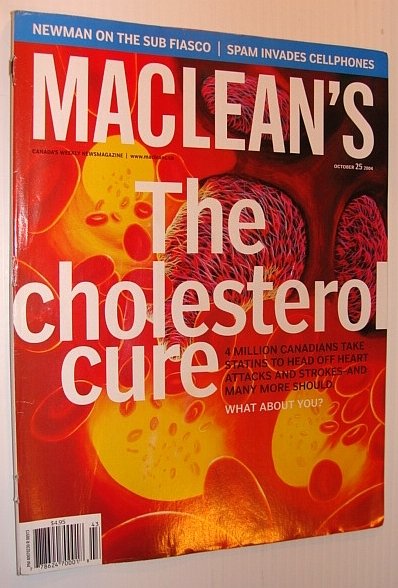 • Maclean's Magazine, 25 October 2004 The Cholesterol Cure - are statin drugs ok?, Are we safe enough in the post 9, 11 world, Canada's submarine fiasco, Moscow's Legacy - the burden of the past, Text message spam, On the road with Will Ferguson, Bringing back Oscar Cahen Magazine Back Issues