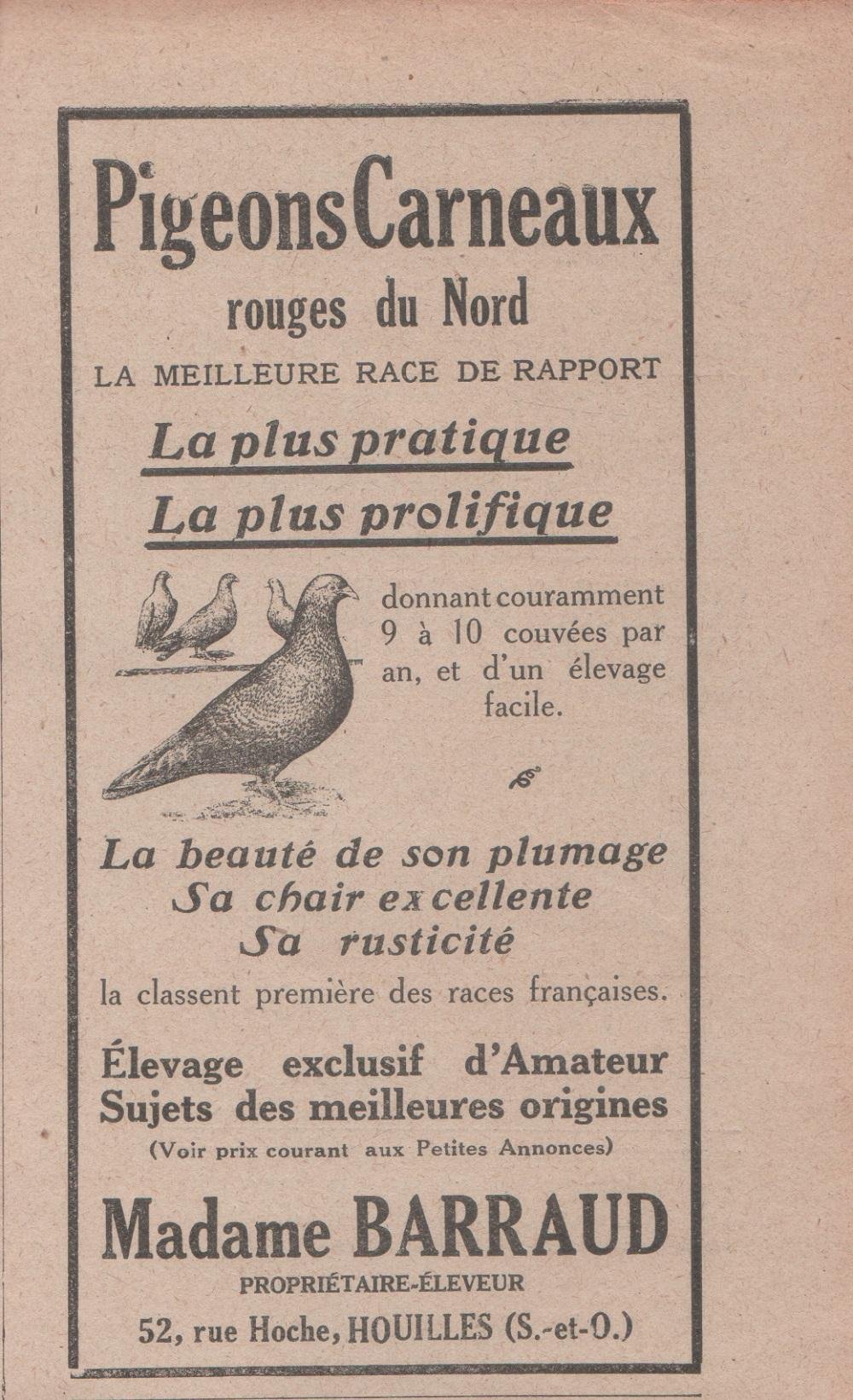 Madame Barraud , Houilles S.etO., Pigeons Carneaux rouges du Nord. Advertising 1926