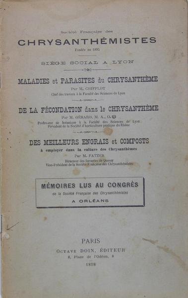 Octave Doin paris 1898. Plaquette In/8 broché36 p. 1 planche dépliante. Mémoires lus au congrès de la Société Française des Chrysanthèmistes à Orléans.