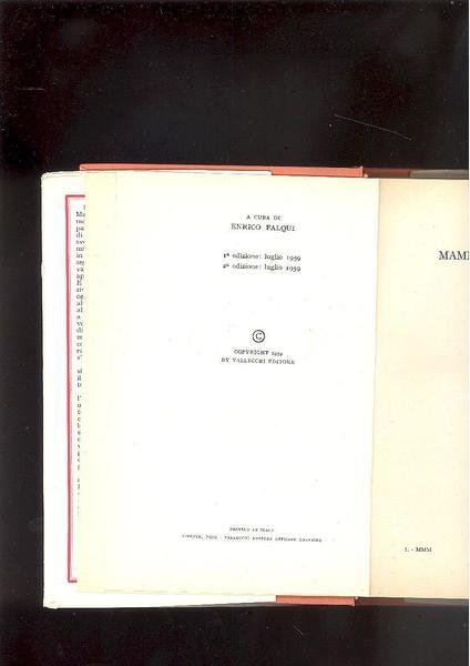 IN 8° picc., pp.331. LEGATURA EDITORIALE IN PIENA TELA RIGIDA ARANCIONE CON TITOLO IN ORO ENTRO TASSELLO VERDE AL DORSO + SOVRACOPERTINA ILLUSTRATA A COLORI CON TITOLO SU FONDO NERO. OPERA POSTUMA DI MALAPARTE, INTEGRALMENTE INEDITA, ORDINATA DA ENRICO FALQUI. NEL LIBRO, L'AUTORE SI CONFESSA A CUORE APERTO, CON LA PROPRIA MADRE IN PUNTO DI MORTE. OTTIMA CONSERVAZIONE. ID 5747