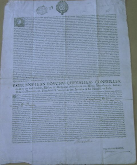 Document imprimé 53 x 40 xm - portant trois tampons (Dauphiné) avec quelques mentions manuscrites. Excellent état. Long texte pour la taxe sur les eaux de source, ruisseaux, et riviéres en Dauphiné, affiche avec la signature de Etienne Jean Bouchu chevalier et conseiller du Roy.