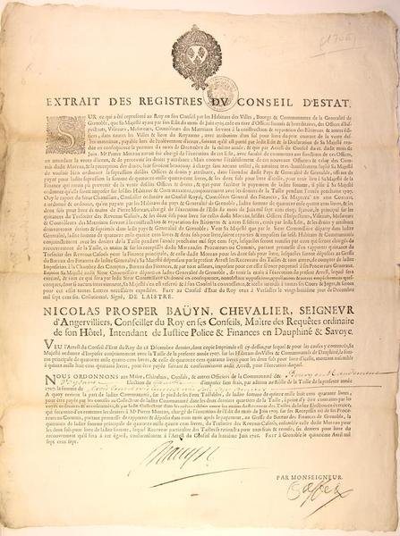 Document affiche imprimé 49 x 38 xm - portant un tampon (Dauphiné) avec quelques mentions manuscrites. Bordure gauche insolée. "Finances en Dauphiné & Savoye"