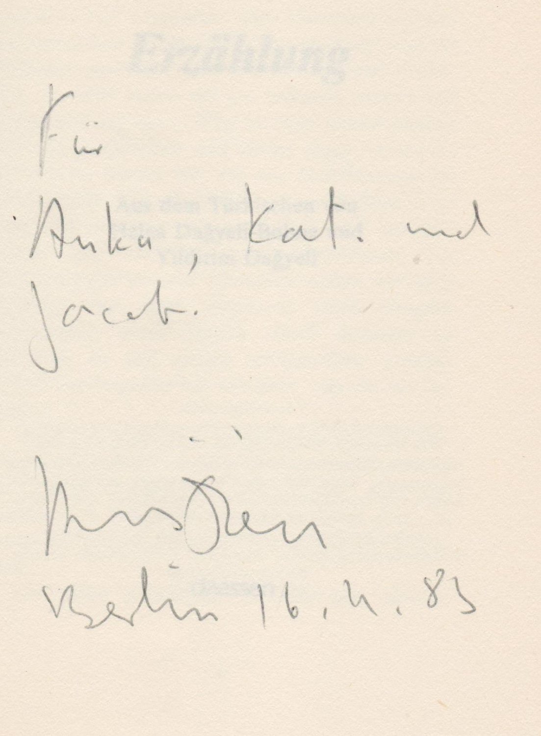 Mit einer kurzen persönlichen Widmung und der Signatur des Autors auf dem Vortitel (1983).