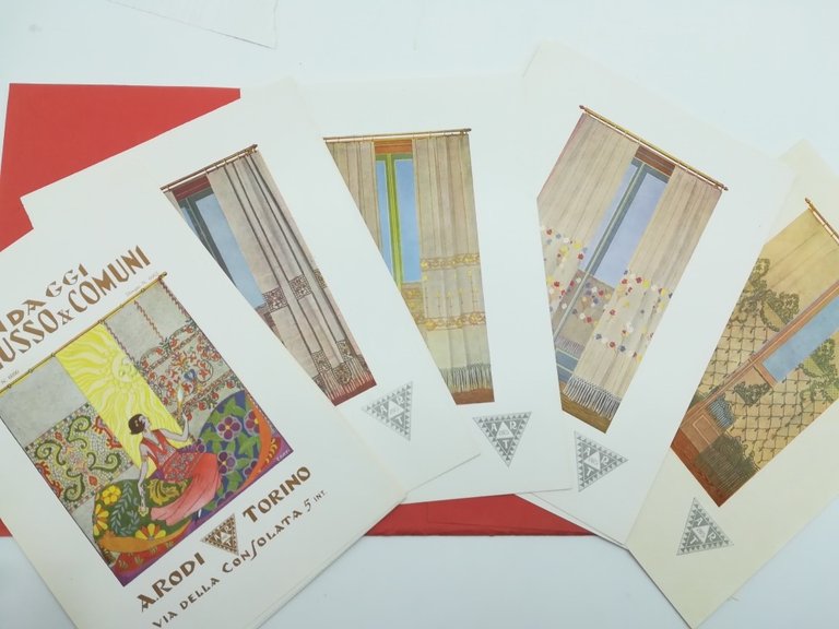 Cartellina in brossura rossa cm 17 x 25 contenente 14 tavole sciolte illustrate in tricromia con vari modelli di tende + 1 tavola con listino prezzi (dal listino prezzi, che elenca il numero di ciascuna illustrazione, si evince che la pubblicazione e' completa) + 1 tavola con due campioncini originali di tela ecru e bianca applicatati su carta. Elegante catalogo di questa ditta torinese, Annibale Rodi, con sede in via della Consolata, specializzata nella produzione di tendaggi ricamati nelle tinte blu, granata, verde e giallo. La prima tavola illustrata, che funge da frontespizio della raccolta, presenta una bella illustrazione di Edoardo Cotti, pittore e illustratore nato a Frassinello Monferrato nel 1871 e morto a Torino nel 1940. Dedico' la sua attivita' soprattutto all'ideazione di copertine, testate di giornali, ex libris e francobolli di cui numerosi esempi si possono vedere nella rivista torinese "L'Artista moderno" alla quale Cotti collaboro' lungamente con disegni di fregi e motivi decorativi.