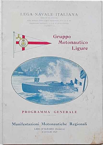 In 8° (cm. 24 x 17); pagg. 19; con 1 cartina percorso regate motonautiche in scala 1:12.500 ripiegata f.t. (copre da Priaruggia, Vernassola, Boccadasse ad oltre Molo Giano e Molo Galliera) e illustrazioni n.t.; leggera cartonatura originale figurata a due colori. Macchia d'umido con minime perdite all'angolo inferiore esterno e alla carta. G. ** Raro e interessante.