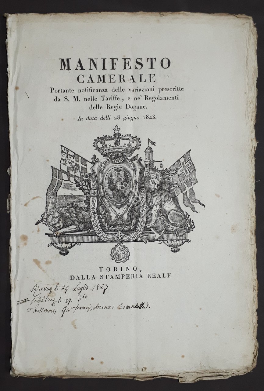 Manifesto Camerale - Portante notificanza delle variazioni prescritte da S. M. nelle Tariffe e nei Regolamenti delle Regie Dogane. In data 28 Giugno 1823 Pagine - 27 Condizioni molto buone