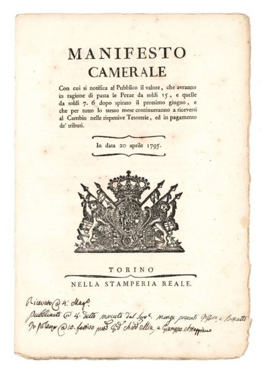 Manifesto camerale con cui si notifica al Pubblico il valore, che avranno in ragione di pasta le Pezze da soldi 15, e quelle da soldi 7.6 dopo spirato il prossimo giugno, e che per tutto lo stesso mese continueranno a riceversi al Cambio nelle rispettive Tesorerie, ed in pagamento de' tributi.