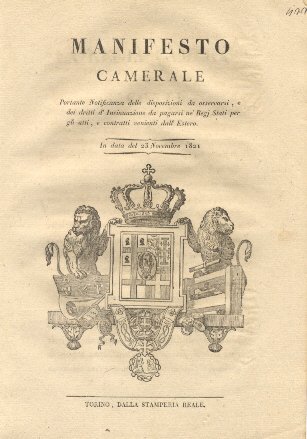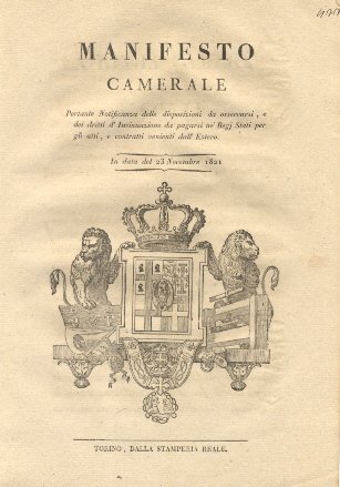Manifesto camerale portane notificanza delle disposizioni da osservarsi, e dei dritti d'Insinuazione da pagarsi ne' Regj Stati per gli atti, e contratti venienti dall'Estero . 23 novembre 1821.