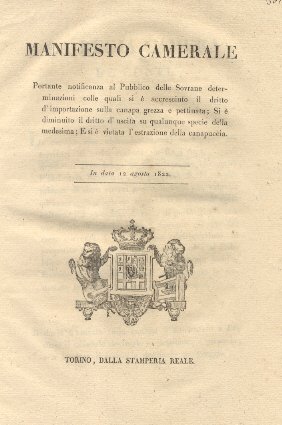 Manifesto camerale portante notificanza al Pubblico delle Sovrane determinazioni colle quali si è accresciuto il dritto d'importazione sulla canapa grezza e pettinata; Si è diminuito il dritto d'uscita su qualunque specie della medesima; E si è vietata l'estrazione della canapuccia . 12 agosto 1822.