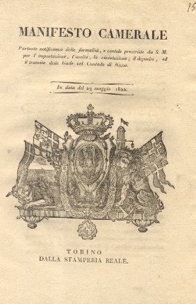 Manifesto camerale portante notificanza delle formalità e cautele prescritte da S. M. per l'importazione, l'uscita, la circolazione, il deposito, ed il transito delle biade nel Contado di Nizza. 29 maggio 1822.