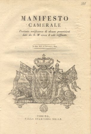 Manifesto camerale portante notificanza di alcune provvisioni data da S. M. circa il sale raffinato.18 settembre 1822.