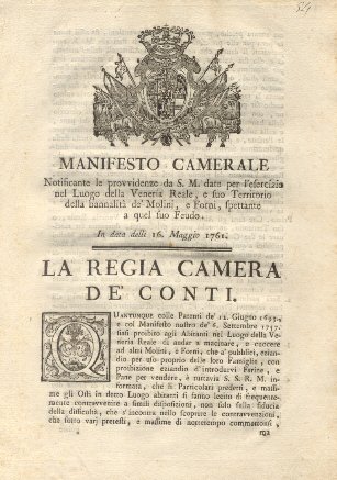 Manifesto Camerale riguardante le provvidenze da S. M. date per l'esercizio nel Luogo della Veneria Reale.16 maggio 1761.