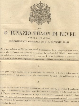 Manifesto col quale D. Ignazio Thaon Di Revel Luogotenente Generale di S. M. ne' Regii Stati, volendo dar opera a che la Commissione incaricata di esaminare la condotta degli Uffiziali, possa condurre a termine con sollecitudine il suo lavoro, senza che il ritardo degli Uffiziali a presentare le loro giustificazioni possa in alcun modo impedire il compimento, determina la proroga di altri cinque giorni di tempo per la presentazione delle giustificazoni predette . 7 maggio 1821.