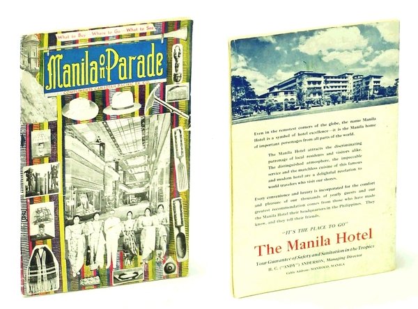 A very informative Manila tourist's handbook, apparently issued for passengers arriving on ships operated by Canadian Pacific. Emphasis is placed upon high-end shopping, "Manila" cigars, and Baguio tourism, but there is much more. All 72 pages are densely packed with informative text, many black and white reproductions of photos, classy ads for local businesses. Handsome two-color ad for the Manila Hotel on back cover includes a photo of the Hotel. Undated but a hint on page 34 suggests a printing date circa 1936. Clean and unmarked with moderate wear. Binding tight. A well-preserved copy of this proudly presented introduction to Manila and the Philippines, printed shortly before the Japanese invasion of WWII. Book