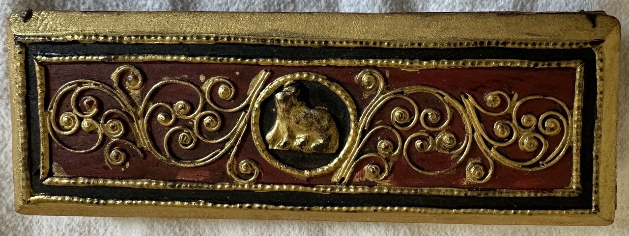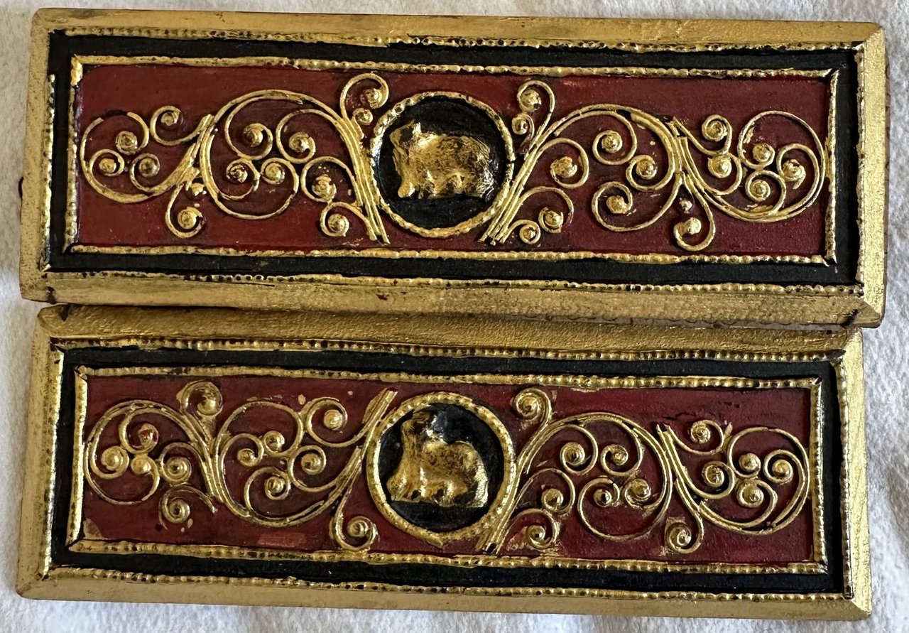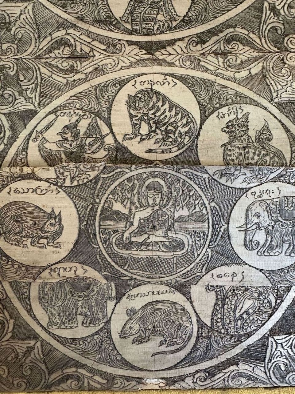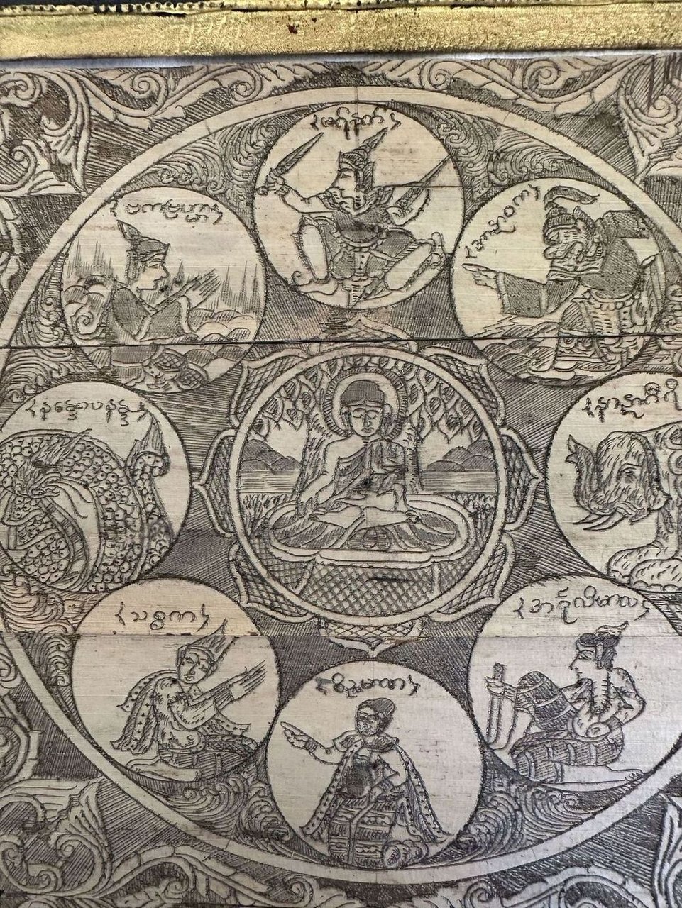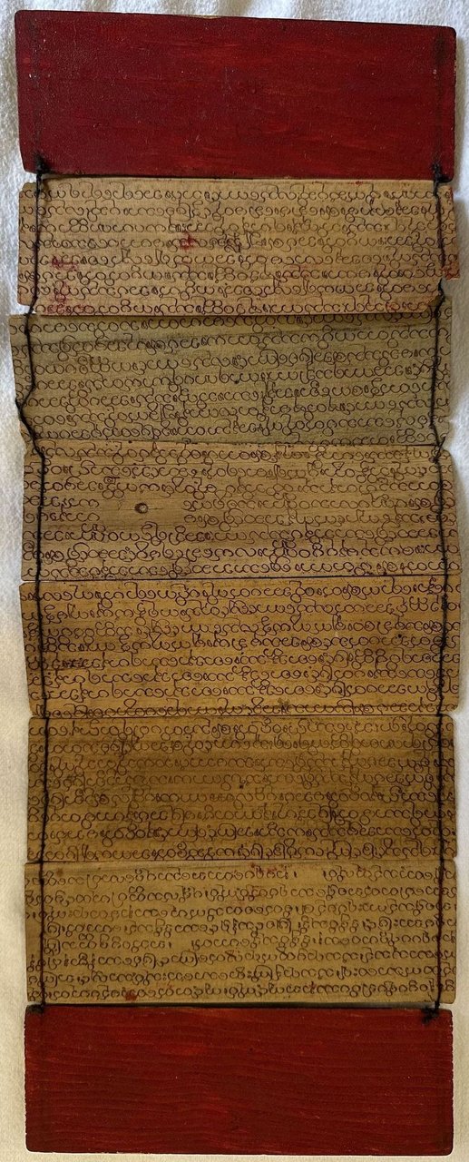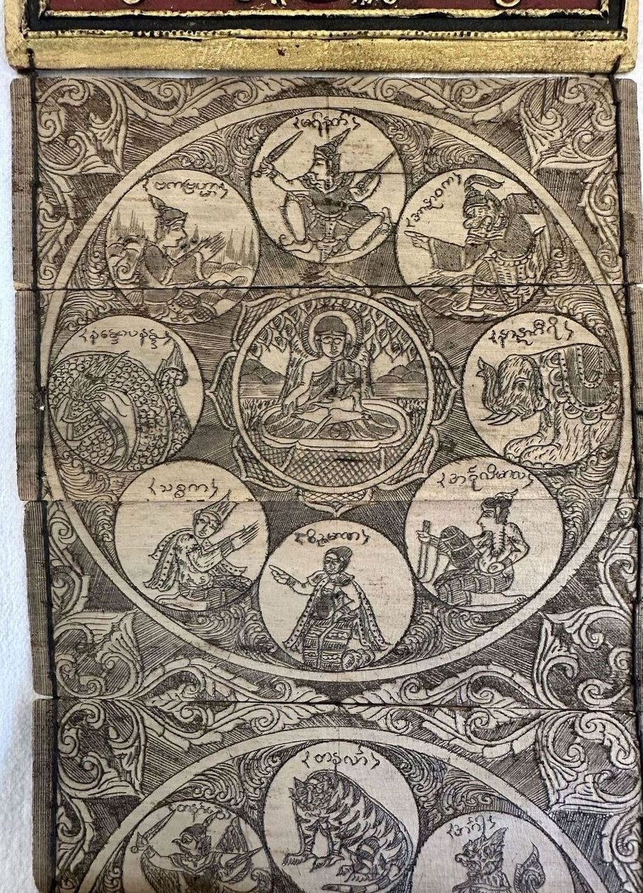 Raro manoscritto birmano su sei foglie di palma legate insieme. Su un lato delle foglie un disegno inciso ripassato ad inchiostro che mostra due vignette: il Buddha Shakiamuni in meditazione sotto l’albero della Bodhi circondato dai Guardiani. Nella seconda vignetta circondato da animali (topo, drago, tigre, elefante). Decorazioni floreali. Al verso un antico manoscritto in lingua Pali birmano nella sua forma arrotondata, un probabile commentario ai Sutra. La copertina sono due tavole di legno dipinte e decorate in oro e rosso in stile tradizionale. Orientativamente della seconda metà dell’ottocento o inizi novecento. Dimensione chiuso cm 5,5x15 Dimensioni aperto cm 15,5x29. Scarce manuscript from Birmania on six palm leafs bound together. On one side of the leaf an engraved drawing with ink showing two vignettes: Buddha Shakiamuni in meditation position under the Bodhi tree surrounded by Guardians. In the second vignette Buddha Shakiamuni surrounded by animals (mouse, dragon, tiger, elephant). Flower decorations In the verso an antique manuscript in Birman Pali language in its rounded form. The text is a probable commentary to Sutra. The cover is in painted and decorated wood in red and gold in traditional style. Not dated but of late 19th century or early 20th century Dimension closed cm 5,5x15 Dimension opened cm 15,5x29
