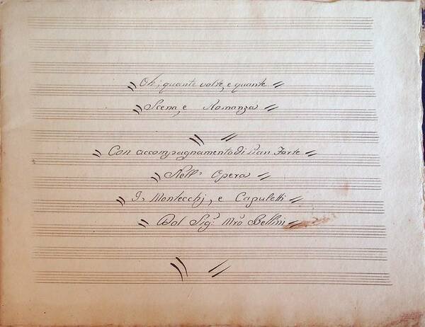 MANOSCRITTO MUSICALE COEVO: Oh, quante volte, e quante - Scena, e Romanza - Con accompagnamento di Pian Forte - Nell'opera I Montecchi, e Capuletti. Del Sig. Mro Bellini.