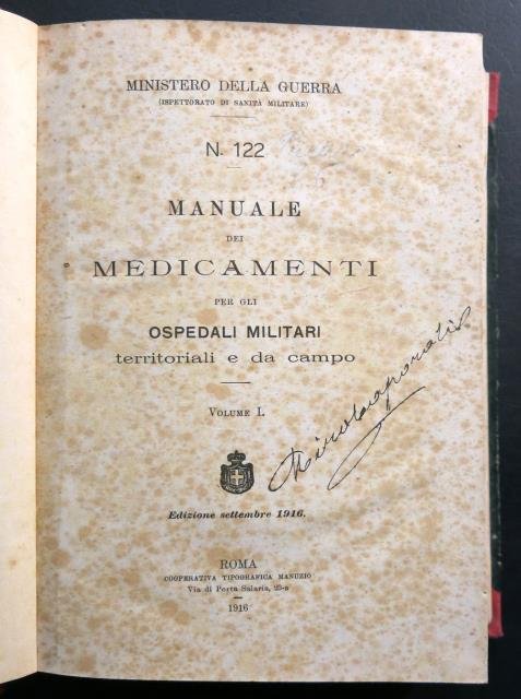 Roma, Cooperativa Tipografica Manuzio, 1916. Edizione settembre 1916. Numero 122. Volume I. In 8vo, pp. LXIV, 814 (con Indici), leg. coeva ma non orig. in cartonato verde con dorso in tela rossa. Tra gli argomenti: Norme e disposizioni che regolano il sevizio farmaceutico militare, principi generali di tecnica farmaceutica, medicinali, veleni e controveleni, analisi dell'acqua potabile e delle derrate alimentari. Foxing alle pagine ma buono.