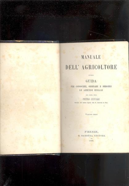 IN 16°, pp.XX + 474, RILEGATO D'EPOCA CON DORSO TELATO E TASSELLO DI CARTA<BR>RIMANEGGIATO CONTITOLO MANOSCRITTO, PIATTI MARMORIZZATI. UNA TAVOLA f.t. + v.r.<BR>RAFFIGURANTE PIANTA ED ALCUNI SPACCATI DI UN FRANTOIO PER OLIVE USATO NEI<BR>MONTI PISANI. PIETRO CUPPARI ( ME. 1816 - PI. 1870 ),AGRONOMO ITALIANO. LAUREATO<BR>IN MEDICINA FU UNO DEGLI AGRONOMI + FAMOSI DEL SUO TEMPO. CHIAMATO ALL'UNIVERSITA' DI PISA QUALE DOCENTE DI AGRONOMIA E PASTORIZIA, VI RESTO' FINO<BR>ALLA MORTE. COLABORO' CON LE PIU' IMPORTANTI RIVISTE AGRARIE ITALIANE, COMPRESO<BR>IL GIORNALE DELL'ISTITUTO TECNICO DI JESI, CHE IL 27 AGOSTO 1883, FU INTITOLATO AL SUO NOME. E' SEPOLTO NEL CAMPOSANTO MONUMENTALE DI PISA.<BR>PIATTI UN PO' CONSUNTI, ALTRIMENTI OTTIMA CONSERVAZIONE.ID 2223
