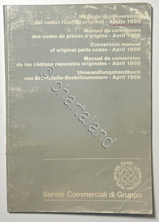 Manuale di Conversione dei Codici Ricambi Originali Hurlimann SAME Lamborghini - ed. 1986 Testo introduttivo in multilingua; testo tecnico in lingua italiana. Pagine 210 Copertina semirigida. Condizioni generali buone.