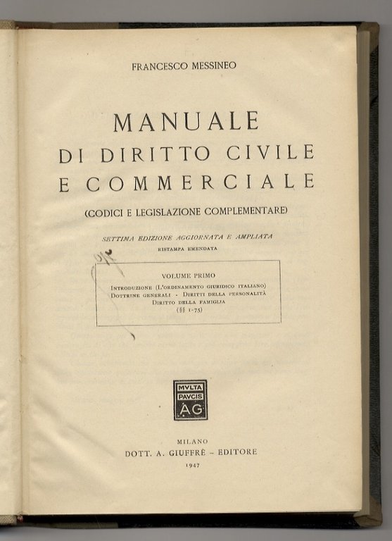 Manuale di diritto civile e commerciale. (Codici e legislazione complementare). Settima edizione aggiornata e ampliata. Ristampa emendata. Volume primo [- volume terzo].