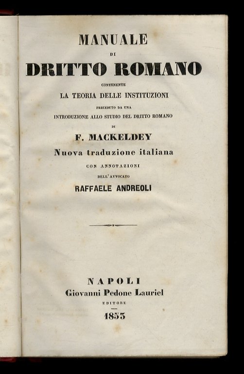 Manuale di diritto romano contenente la teoria delle Instituzioni precededuto da una introduzione allo studio del diritto romano di F. Mackeldey. Nuova traduzione italiana con annotazioni dell'avvocato Raffaele Andreoli.