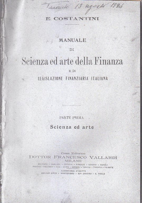 MANUALE DI SCIENZA ED ARTE DELLA FINANZA PARTE I Costantini 1920 Vallardi Libro