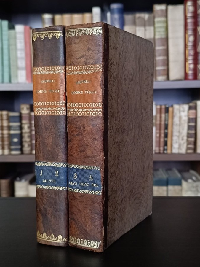 4 volumi in 2 tomi in-8° (cm. 21,6), legature coeve in mezza bazzana, dorsi lisci con titoli in oro su doppi tasselli in bicromia e fregi fitomorfi sempre in oro (lievi tracce d'uso), piatti marmorizzati, tagli spruzzati in rosso; carte in stato molto buono (lievi fioriture sparse). Prima edizione di quest'opera pratica di commento al Codice penale austriaco, il cui Supplemento verrà pubblicato nel 1839. Esemplare molto buono. (NA6)