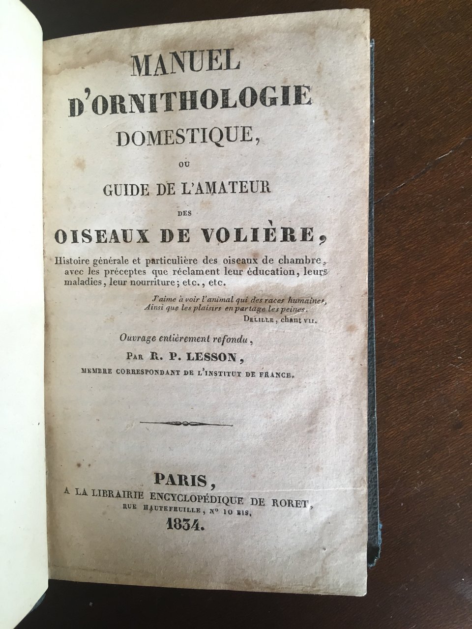 Manuel d'ornithologie domestique, ou guide de l'amateur des oiseaux de volière, histoire générale et particulière des oiseaux de chambre, avec les préceptes que réclament leur éducation, leurs maladies, leur nourriture; etc.,etc. Ouvrage entièrement refondu, par R. P. Lesson, membre correspondant de l'institut de France