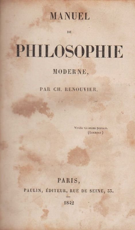 In-16°, legatura ottocentesca con titoli su tassello e fregi in oro al dorso liscio, pp. XXXII-446(2). Non comune edizione originale dell'Opera prima del filosofo francese. Al contropiatto ex-libris del logico, filosofo, mineralogista e storico della scienza inglese William Whewell (Lancaster, 1794 - Cambridge, 1866). Bruniture alle prime e ultime carte; nel complesso bell'esemplare, con buona provenienza. Charles-Bernard RENOUVIER (Montpellier, 1815 - Prades, 1903) è stato un filosofo francese. Fu iniziatore e massimo rappresentante del neocriticismo francese e maestro di Octave Hamelin. Il tema fondamentale della filosofia di Renouvier è dato dall'esigenza di rivendicare la libertà individuale, compromessa dai sistemi sia idealistici, sia positivistici. Ne deriva una filosofia nella quale campeggiano il finito, il fenomeno e la persona. Si tratta sostanzialmente di un kantismo, risultante da una evidente correzione e semplificazione della dottrina kantiana, perché si pone al di là del dualismo di soggetto conoscente e mondo oggettivo.