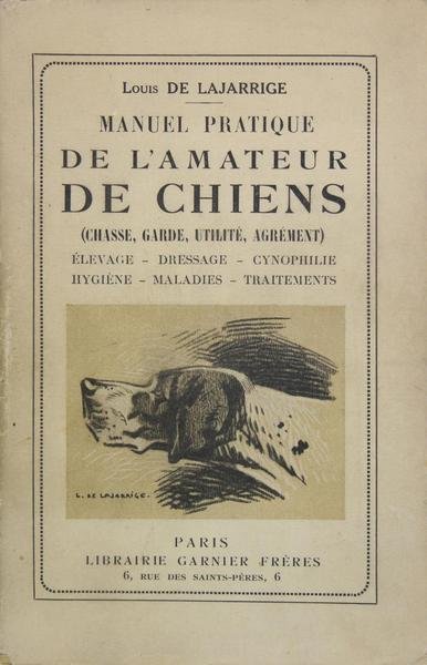 Paris, Editions Garnier Frères, s.d. (1933). In-8 broché, couverture illustrée, 314 pages, 32 p. de catalogue. Elevage, dressage, cynophilie et hygiène du chien de chasse, de garde, d’utilité et d’agrément. Illustré de 50 figures en noir dans le texte de l’auteur. Un chapitre inédit sur les maladies du chien et leur traitement. Mouchon, 1171.