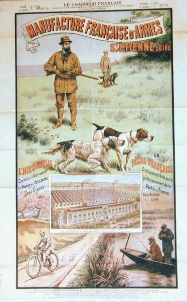 Le chasseur français, 1895. Affiche 65 x 42 cm : au verso la une et la dernière du journal "Le chasseur Français" daté de Juillet Août 1895 et au recto une affiche publicitaire pour la Manufacture Française d'armes de St Etienne. Petites déchirures en bordure sans gravité. Affiche ayant conservé la fraîcheur de ses couleurs.
