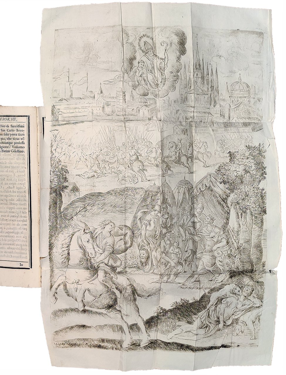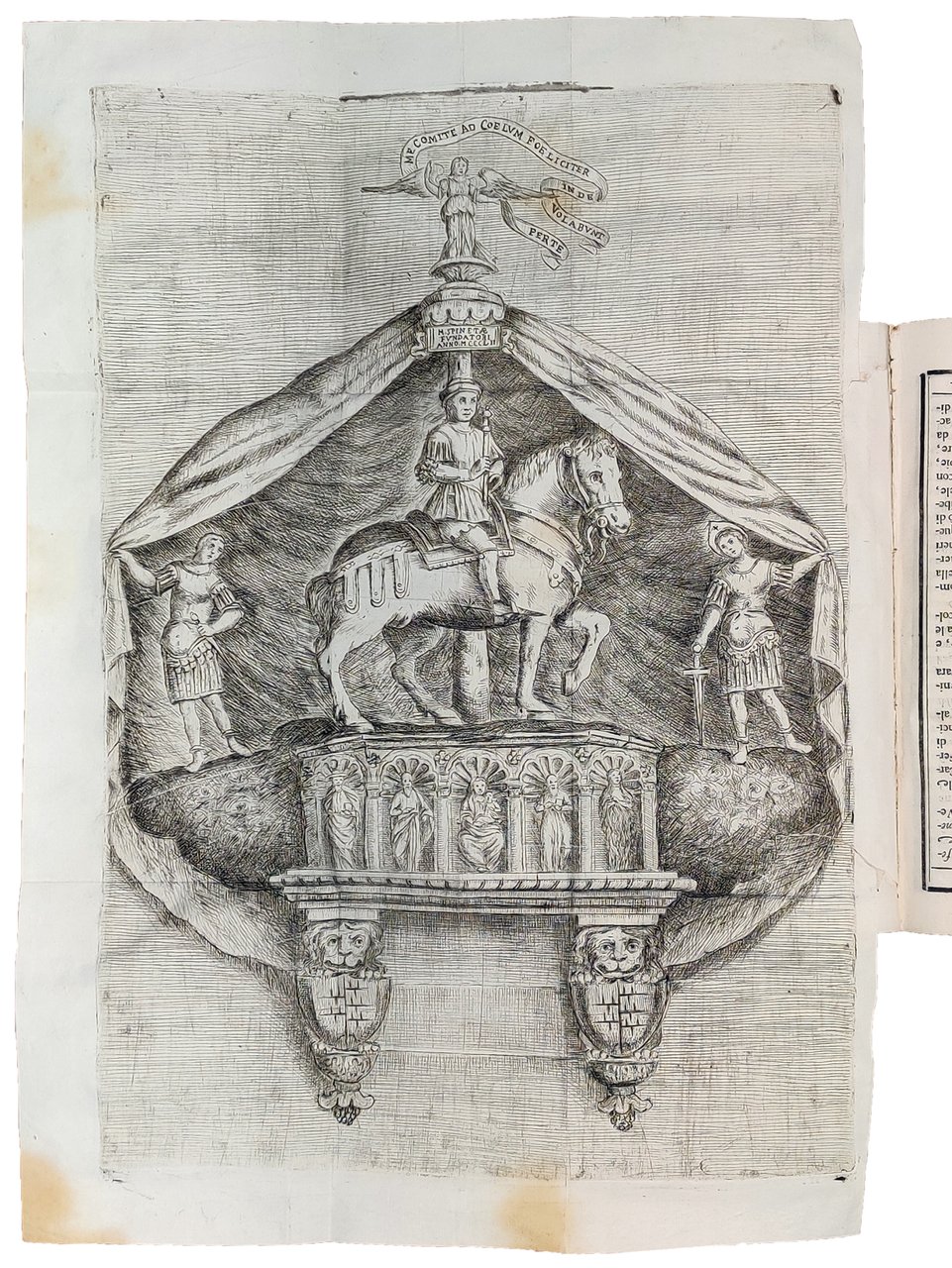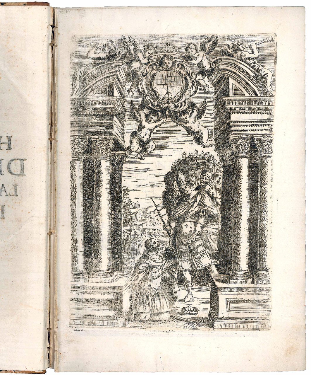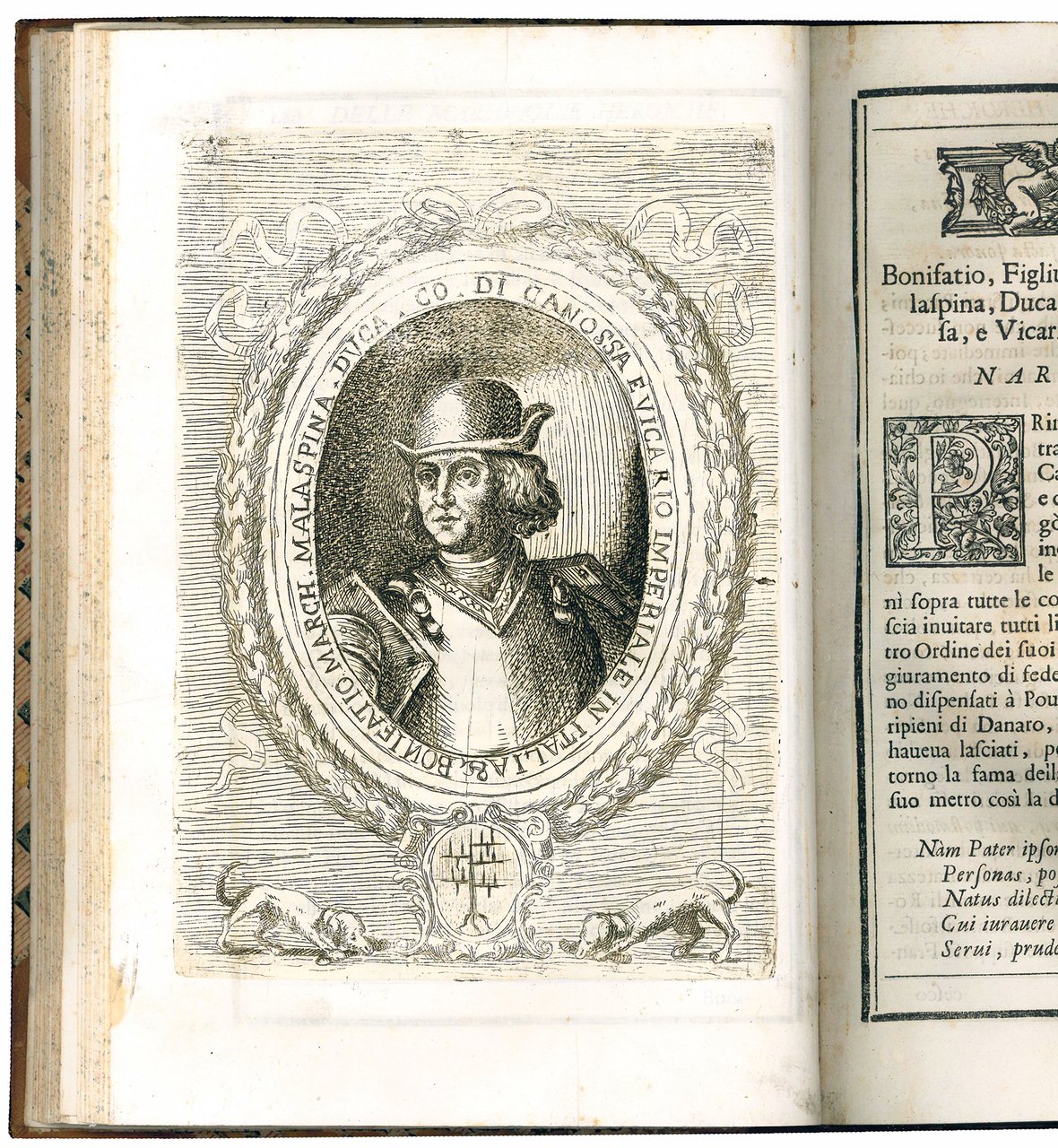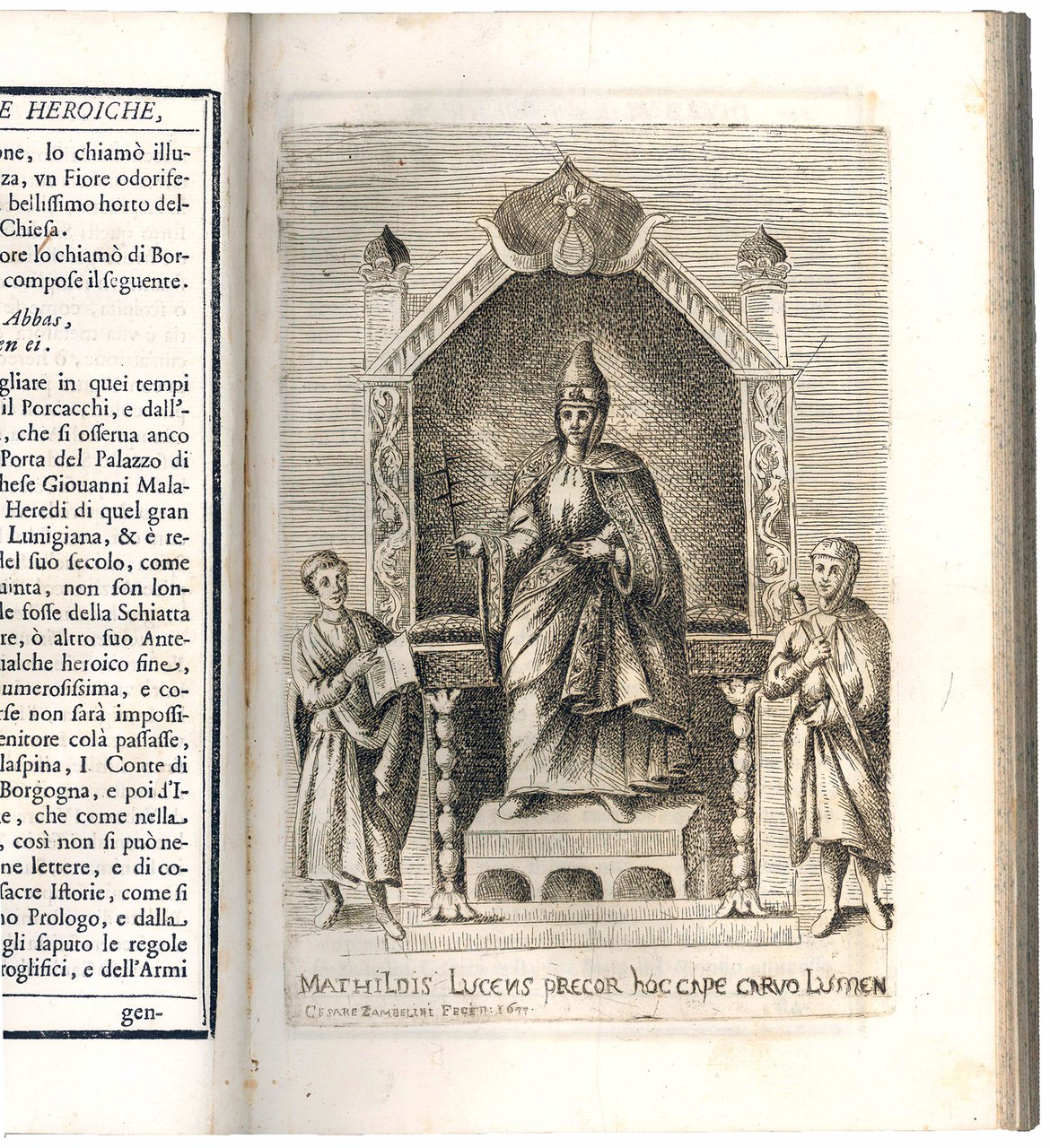 The plates include an allegorical frontispiece, the coat-of-arms of the dedicatee, a battle scene in front of the Milan Cathedral signed by Cesare Zambelini and dated 1677, the Malaspina family tree with a view of Luni, an oval portrait of Sigfrido, Attone, Tedaldo, and Bonifatio Malaspina, a view of Canossa, an oval portrait of Matilda, the equestrian monument of the Marquis Spinetta, and a portrait of Matilda seated on a throne, flanked by a monk presenting her with a book on one side and a soldier clutching a sword on the other, with the epigraph “Mathildis lucens precor hoc cape carvo Lumen” (the plate is dated 1677 and signed by Zambellini). The Latin inscription is reproduced on the following page with the same typeface as the engraving, whose punches were specially made for the occasion. In text there are woodcut illustrations depicting coins of the Malaspinas and Adalberto of Tuscany, numerous full- and half-page genealogical trees, and an engraving of a coat-of-arms.
