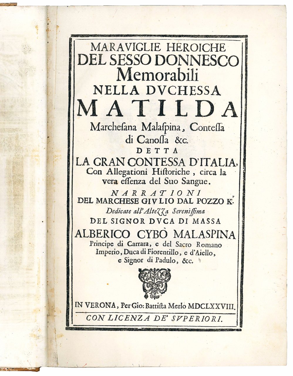 Maraviglie heroiche del sesso donnesco memorabili nella duchessa Matilda Marchesana Malaspina, Contessa di Canossa &c. detta la Gran Contessa d'Italia, con allegationi historiche, circa la vera essenza del suo sangue. Narrationi del marchese Giulio Dal Pozzo K.r [...]