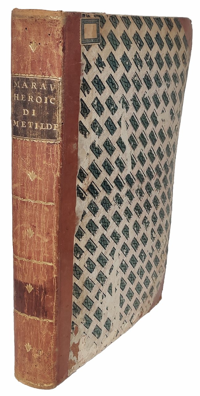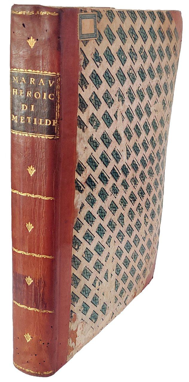 Folio (285x190 mm). [8], 520 pp. and [12] engraved plates (3 folding). Collation: [π]4 A-Ttt4. Half-title: Maraviglie heroiche di Matilda la Grancontessa d'Italia. Woodcut decorative initials and headpieces. Text throughout within a typographic border. Two of the plates are signed by Cesare Zambelini and dated 1677. Slighlty later half calf gilt, morocco lettering piece on spine, panels covered with colored papers, sprinkled edges (slightly rubbed). Some occasional light foxing, a few marginal tears skillfully repaired in two of the folding plates, otherwise a very good, genuine copy.