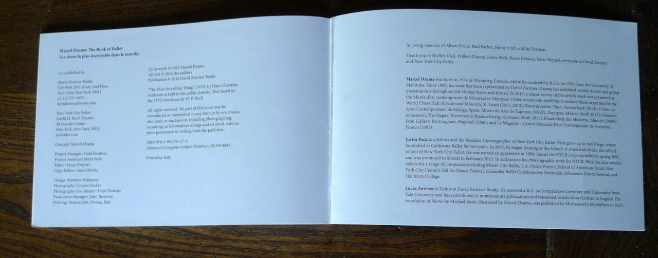 Marcel Dzama,THE BOOK OF BALLET.La Chose La Plus IncroyableDans Le Monde.David Zwirner Books /New York City Ballet, New York 2016,brossura, 23x15,5 cm., pp.48 non numerate,illustrazioni a colori,testo in inglese,ISBN: 978-1-941701-27-0,peso: g.300cod.9489CONDIZIONI DEL LIBRO: come nuovodalle note editoriali:Text by Hans Christian Andersen. Interview with Marcel Dzama and Justin Peck by Lucas ZwirnerMarcel Dzama’s prolific output as a draftsman has, in recent years, expanded to include works in many different media—film, sculpture, dance, collage, and even a recent collaboration with artist Raymond Pettibon are all part of his current practice. His at times surreal, often frightening vision, translates beautifully to film and dance, where actors in complex costumes bring to life the worlds Dzama draws on paper.Published on the occasion of his collaborative ballet with choreographer Justin Peck and musician Bryce Dessner at the New York City Ballet, The Book of Ballet documents the genesis of all aspects of the project. The gem-like booklet begins with “The Most Incredible Thing,” the Hans Christian Andersen story on which the ballet is based, and continues to present Dzama’s costume designs. The images not only show final design decisions, but also chart the changes in costumes as the project unfolded, and the ways in which Dzama’s conception of the characters in the ballet shifted over time. The book closes with a conversation between Dzama and Peck in which choreographer and artist discuss the nuances of their collaborative process, and the important role of renowned composer Dessner in bringing the project to life.