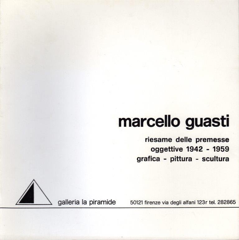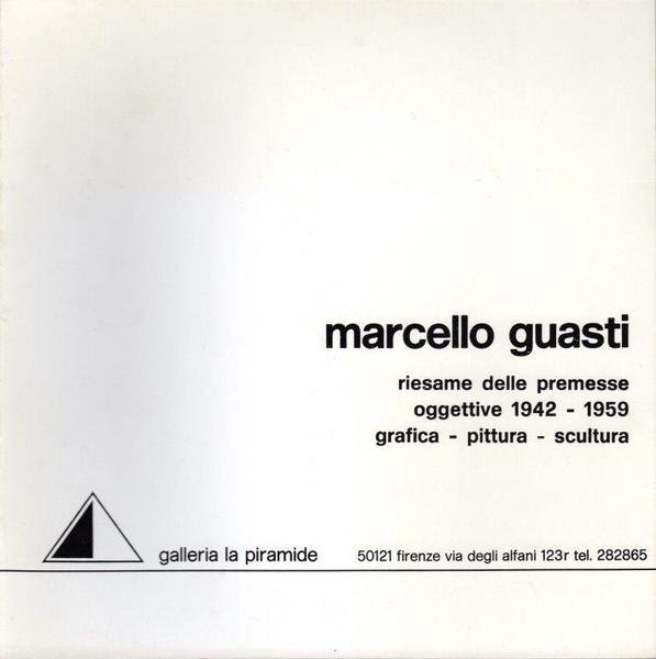 Marcello Guasti. Riesame delle premesse oggettive 1942-1959, prima edizione settembre 1973, formato 21 x 21. <BR>Copertina morbida di colore bianco con titoli in nero al piatto anteriore. Introduzione di Lara-Vinca Masini. All'interno numerose tavole illustrate in b/n e a colori. <BR>Ottime condizioni.