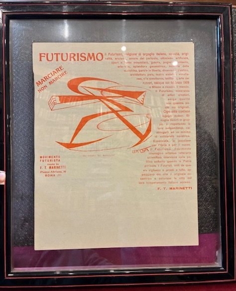 Foglio volante (cm. 23x29,5) stampato in caratteri rossi al recto e al verso. Documento originale pubblicato per cura del Movimento Futurista (Roma, piazza Adriana 30). Al verso, testo di F.T. Marinetti con grande illustrazione de ‘Il pugno di Boccioni’ di Giacomo Balla. Al verso sintetica descrizione dell’Ideologia futurista ed elenco dei movimenti di avanguardia artistico-culturale che da esso derivano. Non comune. Eccellente stato di conservazione. Entro cornice laccata nera con fili intarsiati in rosso.