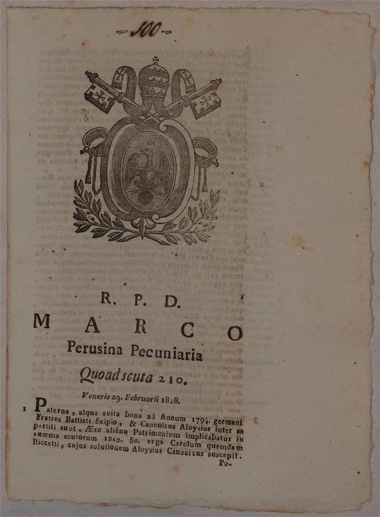 In 4. Dim. 29x21,5 cm. Pp. (4). Interessante pubblicazione del 1828, una sentenza del Tribunale della Sacra Rota del 29 febbraio 1828 per una causa nella diocesi di Perugia. Si tratta della causa sul testamento di Laurenzi secondo cui il cambio da lui effettuato in favore di Carlo Riccetti doveva andare a pieno carico della famiglia Battisti senza il minimo aggravio ai suoi eredi. La famiglia Battisti doveva restituitre ai suoi eredi la somma da lui pagata. In buone condizioni. Copertina assente. Legatura assente. All'interno le pagine si presentano in buone condizioni con fioriture e bruniture. In barbe. Interesting pamphlet of 1828, a sentence of the Trial of Sacra Rota for a trial of 29th of February 1828 in the diocesis of Perugia. It is the trial of the testament of Laurenzi according to the change he did in favour of Carlo Riccetti had to go in charge of family Battisti without ruining his heirs. The family Battisti should give to his heirs the sum Laurenzi payed. In good conditions. Cover is missing. Binding is missing. Inside pages are in good conditions with foxings and yellowings. Uncut copy.
