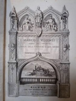 In-8° (cm. 24,6), legatura in m. pelle rossa con fregi romantici e titolo in oro al dorso, piatti in tela rossa con fregi a secco, risguardi marmorizzati; pp. 381 [3] in buono stato con testo inquadrato in doppio filetto, frontespizio inciso in rame f.t. (veduta di Limonta sul Lago di Como) e 24 tavole illustrative incise in rame f.t. da Bonatti su disegno di Focosi; fioriture sparse. Seconda edizione, la prima illustrata del romanzo storico dedicato al Manzoni, amico e maestro del Grossi. Esemplare molto buono.