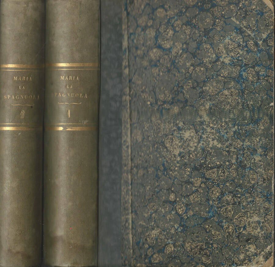 Opera completa in due volumi preceduta da un'introduzione di Eugenio Sue. Prima versione italiana di F. Giuntini. Mezza legatura in tela, con titoli dorati al dorso, quest'ultimo scolorito e segnato dal tempo, con strappetti alle cerniere e piccoli aloni; piatti in cartonato marmorizzato, strappati ai margini e con dissolvenze. Tagli non rifiniti; pagine con testo racchiuso all'interno di cornice decorata, testatina e finalino illustrato ad introduzione e termine di capitolo e capolettera decorato. Pagine dalla 141 alla 144, la numero 151 e dalla 621 alla 624 distaccate al vol. I. Numero complessivo di pagine 1261(642-619).