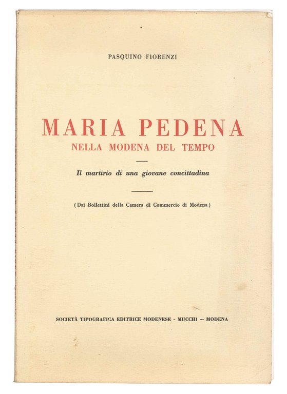 Mm. 316x216. Pp. 93, [3]. Con numerose illustrazioni in b/n n.t. Brossura editoriale con titolo in rosso al dorso e alla cop. ant. Prima ed unica edizione. In queste pagine viene descritta la vicenda di Maria Regina Pedena che, per preservare la propria virtù, venne barbaramente uccisa dal liutaio Eleuterio Malagoli il 2 luglio 1827. Oltre a questa triste storia, viene evidenziato un trentennio di vita tipicamente modenese che, sotto il profilo artistico, letterario, economico, politico e sociale è dei più rimarchevoli.
