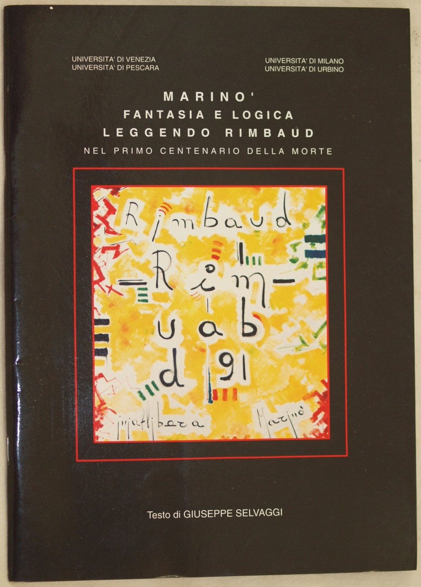 In 4. cm 29x21. Pp. (16)Raro catalogo della mostra "Marinò fantasia e Logica" di Gaetano Marinò su Rimbaud in occasione del centenario della sua morte. Introduzione di Giuseppe Selvaggi e foto delle sue opere. In ottime condizioni. Copertina editoriale in ottime condizioni generali con lievi usure ai margini e dorso. Legatura in ottime condizioni. Pagine in ottime condizioni.Scarce catalogue of the exibition "Marinò fantasia e Logica" by Gaetano Marinò about Rimbaud in occasion of one hundred years from his death.<BR>Introduction by Giuseppe Selvaggi and photoes of his works. In very good conditions. Editorial cover in very good conditions slightly worn in the edges and spine. Binding in very good conditions. Pages in very good conditions.