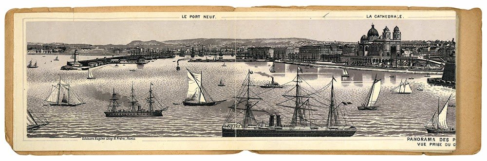 Mm. 119x73. Albun contenente 9 belle fotografie raffiguranti scorci della città di Marsiglia. Brossura editoriale illustrata con piccoli strappetti e minime mancaze marginali.