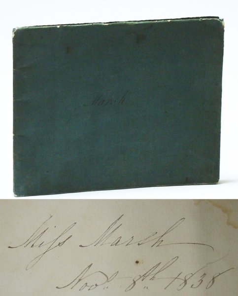 12 unnumbered leaves in what appears to be a contemporary off-the-shelf sketch book protected by a pale green protective outer layer/dust cover upon which is handwritten the name Marsh. Includes nine one-page tissue-protected hand-drawn, -coloured and -lettered maps of: Spain and Portugal; Hungary; Turkey in Asia; Persia; Egypt Arabia Nubia & Abyssinia; Holland; England & Wales; Austrian Empire; Settlement of Noah's Descendants Throughout the World; Palestine or the Holy Land, the last two maps appearing on the ninth leaf. Longitude and latitude indicated at periphery of each map. Many cities and water bodies indicated. Last three leaves blank. Provenance unknown. Handwritten name "Mifs" (Miss) "Marsh, Nov. 8th, 1838" upon verso of front cover. Oblong 29.5cm x 23.3cm. Light moisture marks throughout. Binding intact. We are left to speculate as to who Miss Marsh was and where she lived although, based on the writing, our guess would be that she was English. Given the relative thickness of the pages we believe it highly unlikely that these maps were traced. Rather, they appear to have been assiduously hand-drawn by Miss Marsh, presumably by referring to contemporary cartography. Miss Marsh would probably be amazed by the many border and name changes which have occured since 1838. Book