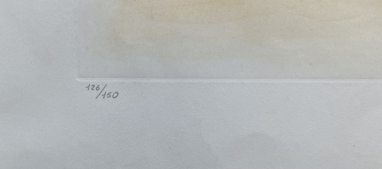 Tiratura 126/150 in basso a sinistra. puntasecca e acquatinta inciso cm. 39 x 58; foglio cm. 56 x 75 Buono (Good) Buon es., leggerissima brunitura sul bordo superiore e sul bordo sinistro.