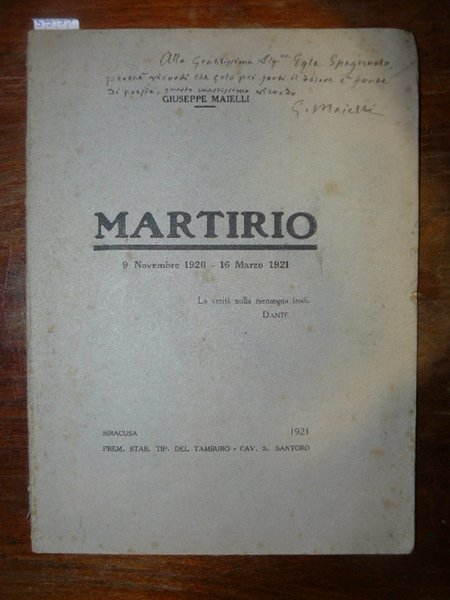 In-8°, pp. 37, brossura editoriale. Tavola fotografica in b/n all'antiporta. Dedica dell'Autore Giuseppe Maielli alla gentilissima Signorina Egla Spagnuolo apposta al piatto anteriore della brossura. Lievi mancanze alle sezioni superiore e inferiore della brossura.