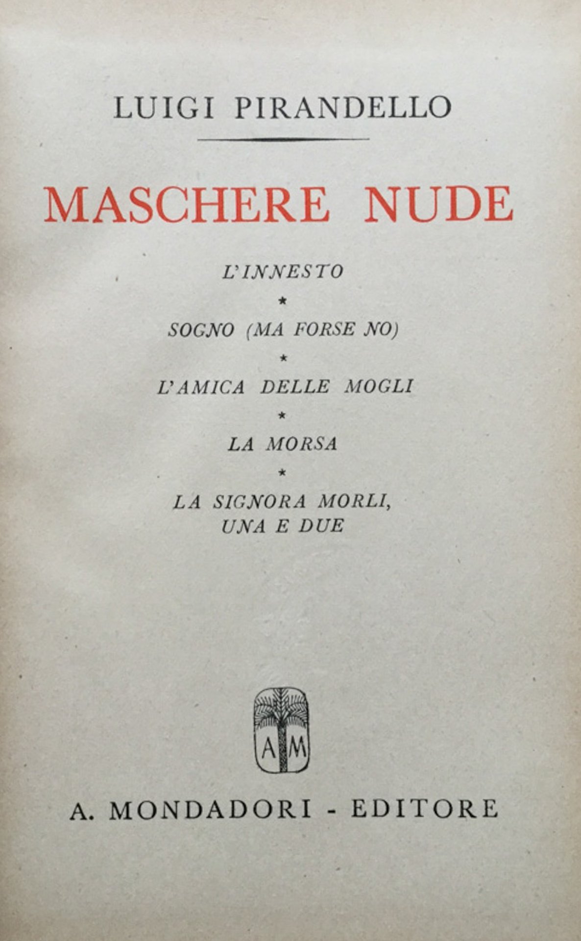 Cm. 18, leg. edit. in p. tela con titoli al dorso e sovr., pp. 389. 4a ediz. Coll. ''Tutto il teatro di Luigi Pirandello'', 6. In Ottavi (15-23cm ) Buono (Good) Buono