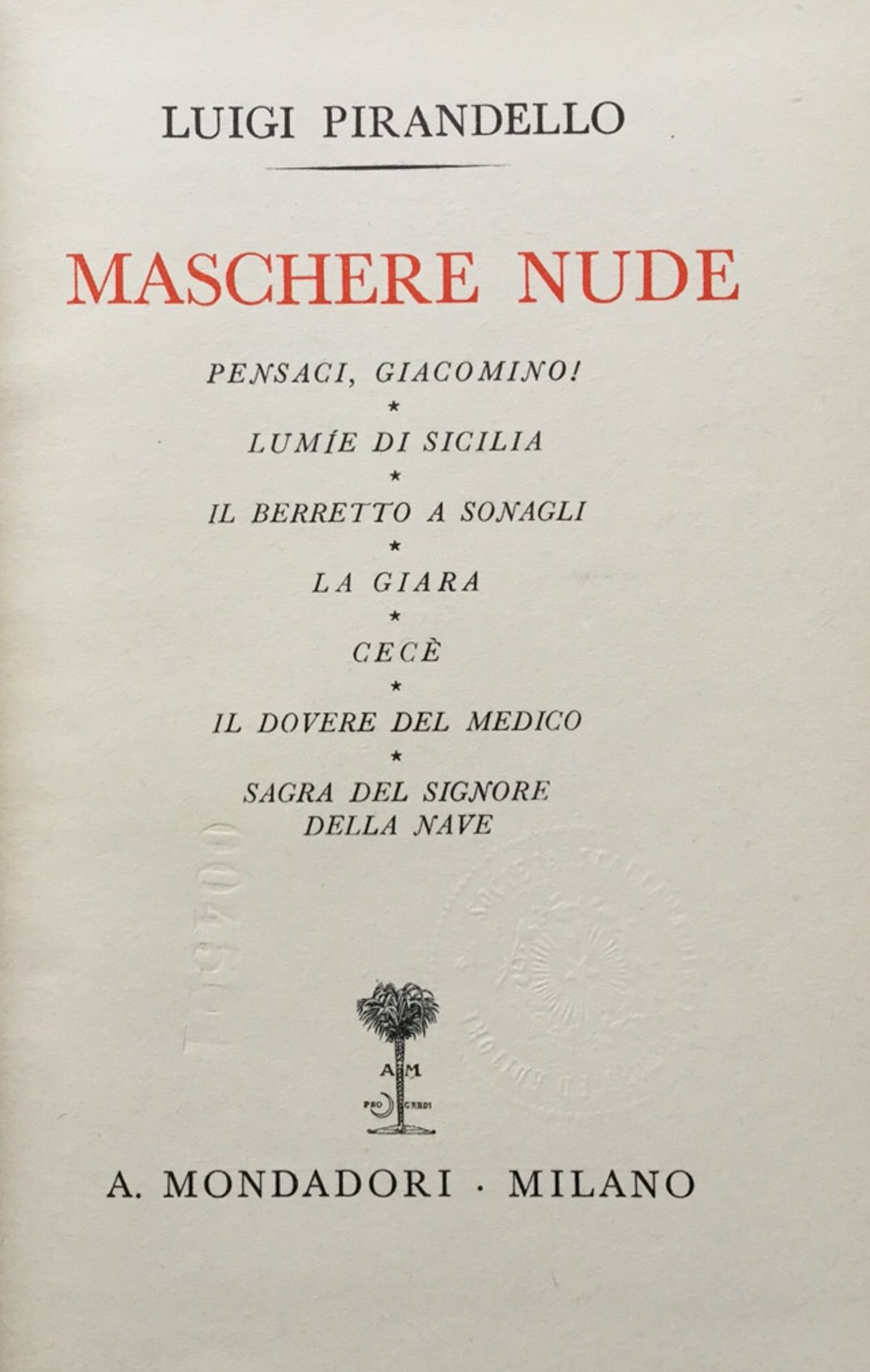 Cm. 18, leg. edit. in p. tela con titoli al dorso e sovr., pp. 389. 3a ediz. Coll. ''Tutto il teatro di Luigi Pirandello'', 6. In Ottavi (15-23cm ) Buono (Good) Buono