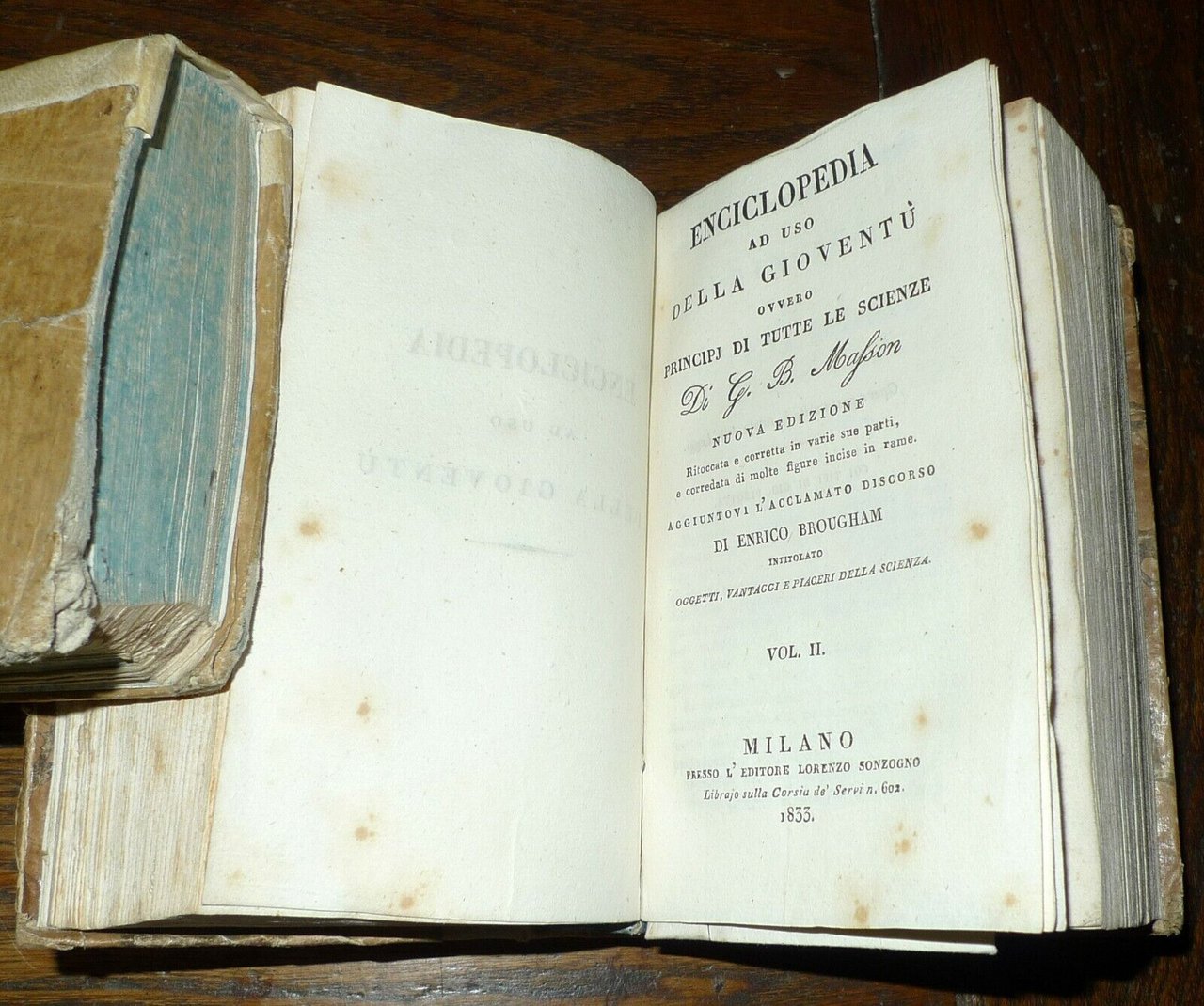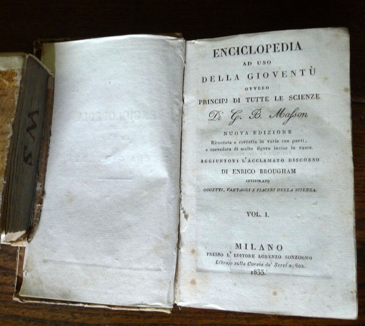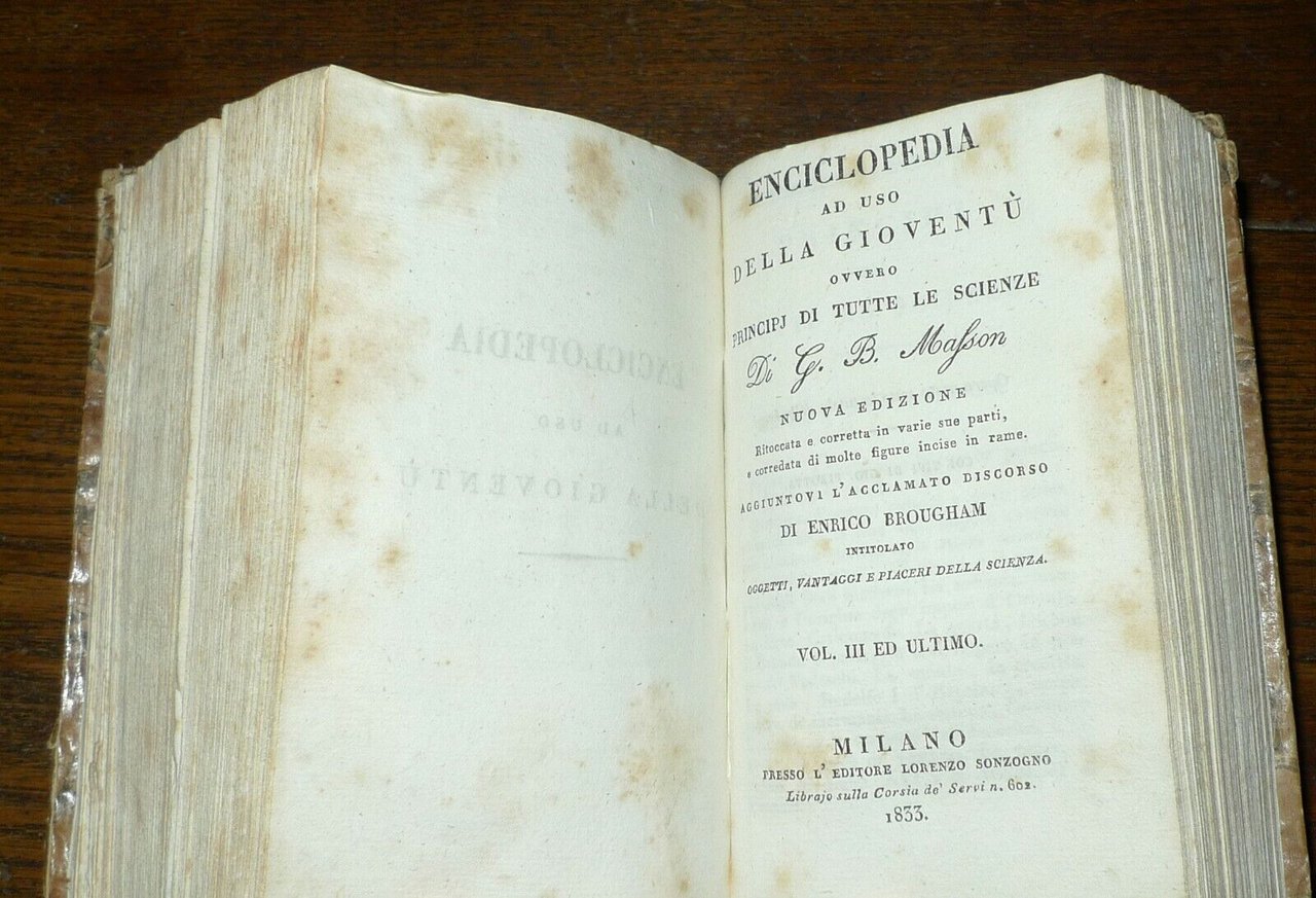 ENCICLOPEDIA AD USO DELLA GIOVENTÙ OVVERO PRINCIPJ DI TUTTE LE SCIENZE DI G.B. MASSON NUOVA EDIZIONERITOCCATA E CORRETTA IN VARIE SUE PARTI,E CORREDATA DI MOLTE FIGURE INCISE IN RAME.AGGIUNTOVI L'ACCLAMATO DISCORSO DI ENRICO BROUGHAMINTITOLATOOGGETTI, VANTAGGI E PIACERI DELLA SCIENZA.VOL.I - VOL.II - VOL.III ED ULTIMO[3 VOLUMI RILEGATI IN UN UNICO TOMO,OPERA COMPLETA].Milano, presso l'Editore Lorenzo Sonzogno,Libraio sulla Corsia de' Servi n.602, 1833,copertina rigida, rilegatura in mezza pelle,13,5x8 cm., pp.VII-279;219;243,con 11 tavole fuori testo anche su pagine ripiegate,peso: g.320