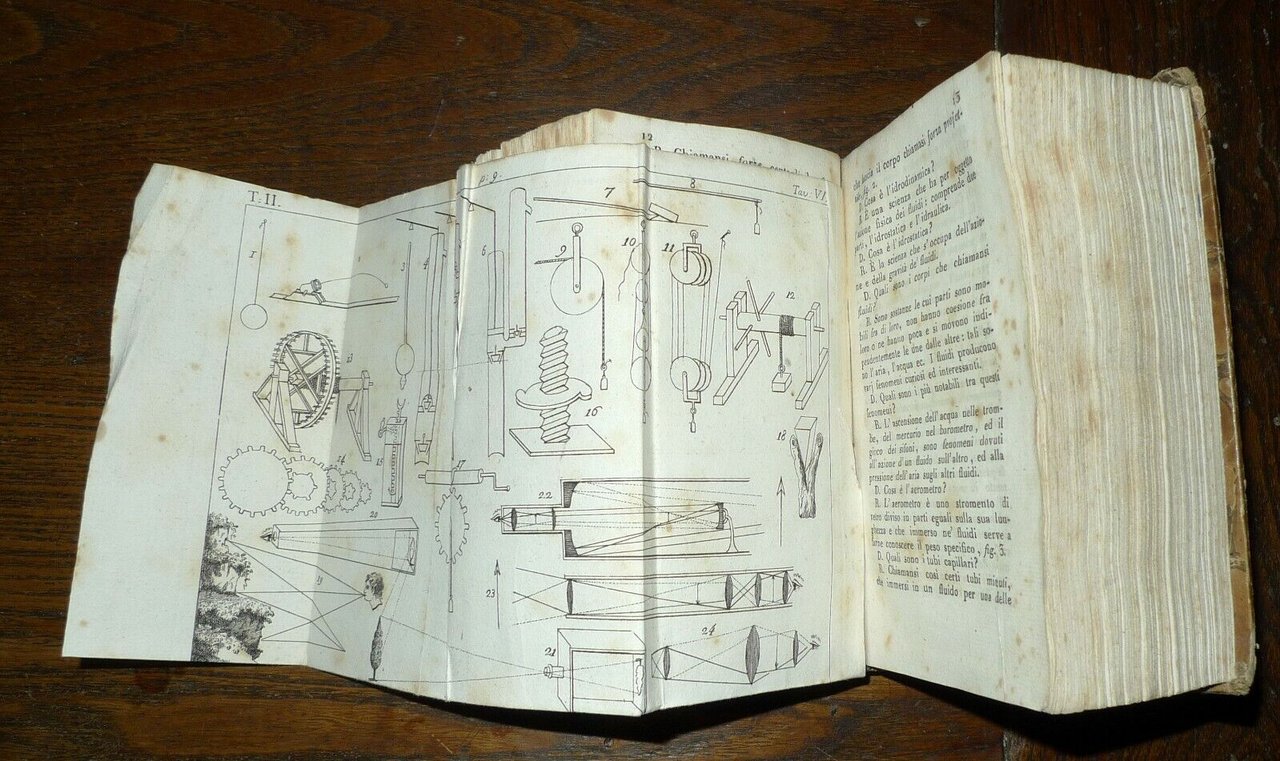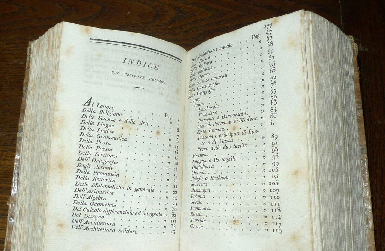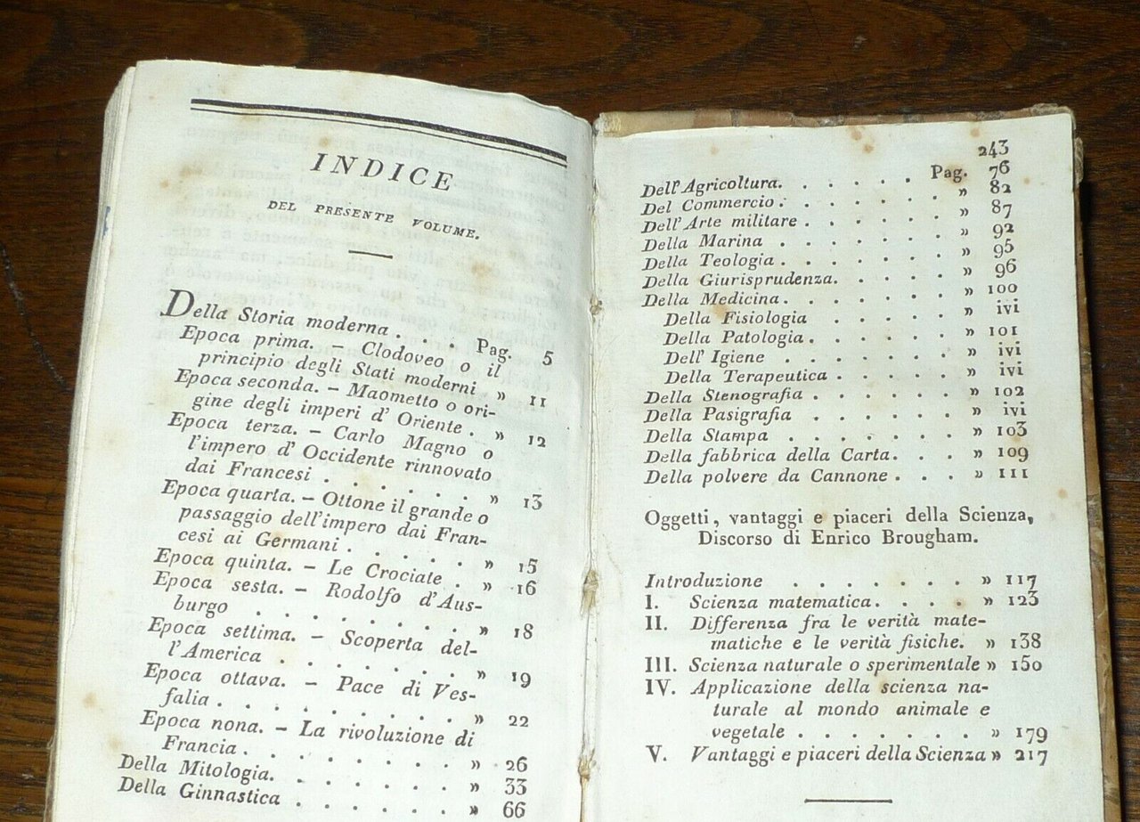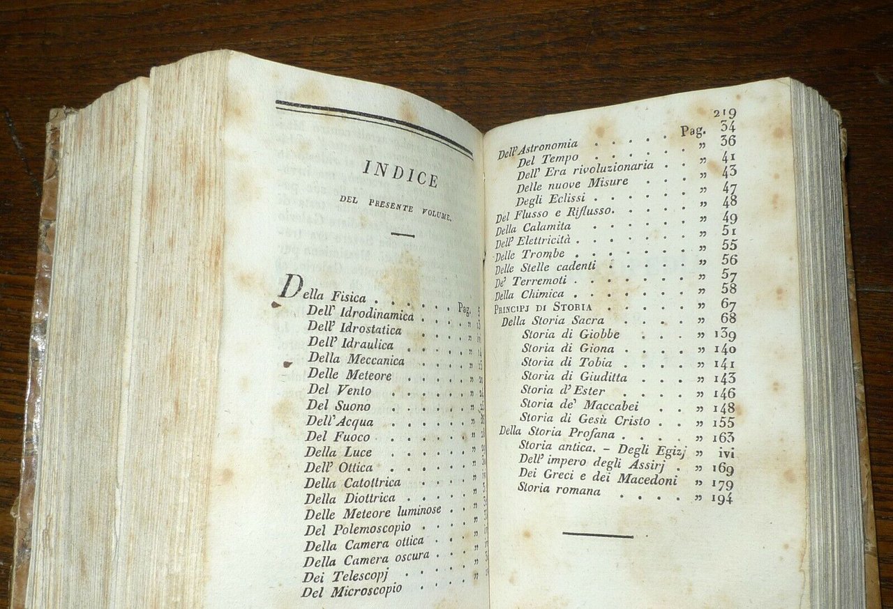ENCICLOPEDIA AD USO DELLA GIOVENTÙ OVVERO PRINCIPJ DI TUTTE LE SCIENZE DI G.B. MASSON NUOVA EDIZIONERITOCCATA E CORRETTA IN VARIE SUE PARTI,E CORREDATA DI MOLTE FIGURE INCISE IN RAME.AGGIUNTOVI L'ACCLAMATO DISCORSO DI ENRICO BROUGHAMINTITOLATOOGGETTI, VANTAGGI E PIACERI DELLA SCIENZA.VOL.I - VOL.II - VOL.III ED ULTIMO[3 VOLUMI RILEGATI IN UN UNICO TOMO,OPERA COMPLETA].Milano, presso l'Editore Lorenzo Sonzogno,Libraio sulla Corsia de' Servi n.602, 1833,copertina rigida, rilegatura in mezza pelle,13,5x8 cm., pp.VII-279;219;243,con 11 tavole fuori testo anche su pagine ripiegate,peso: g.320